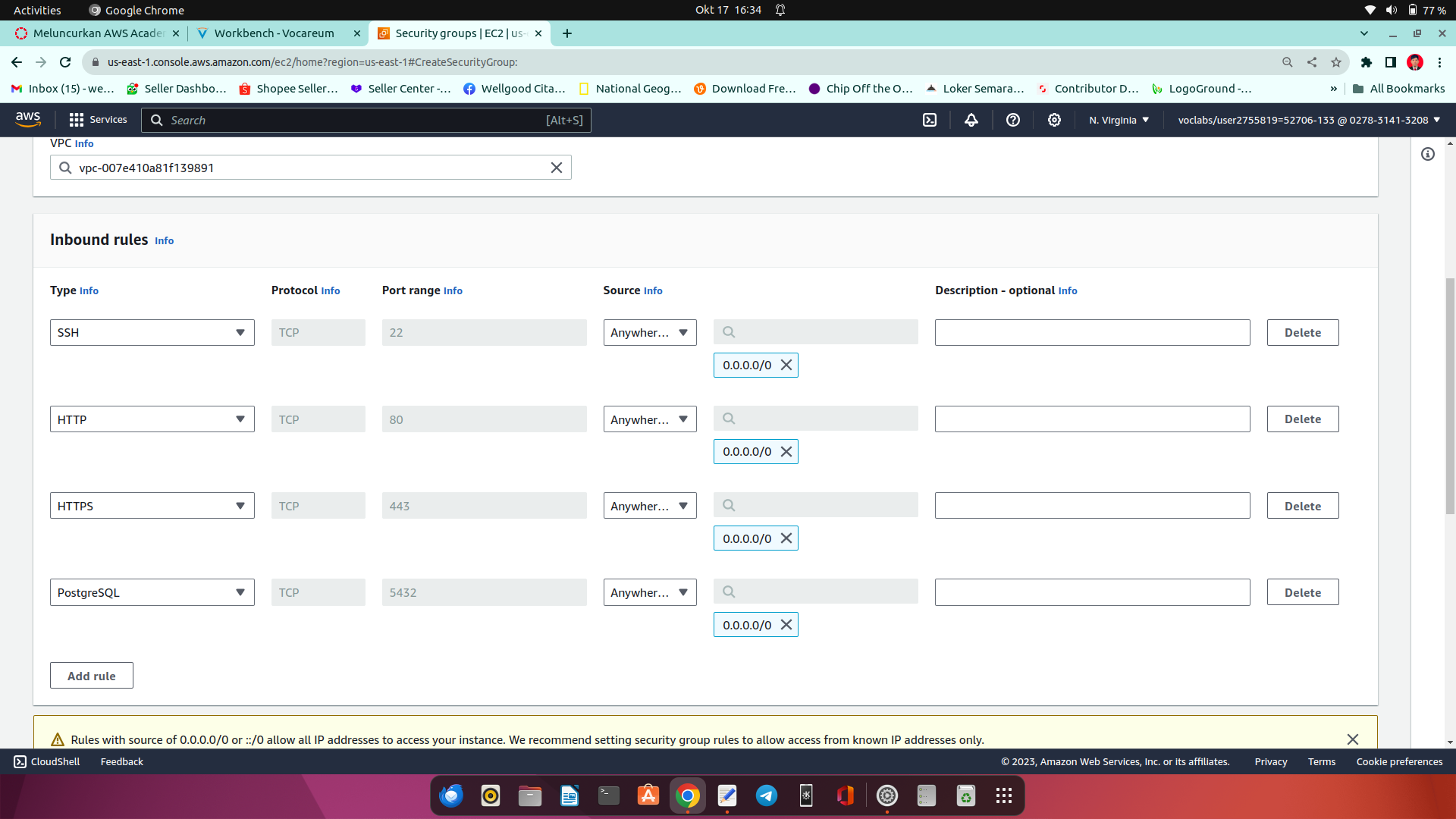 12.tambahkan port 22(ssh),80(http),443(https),5432(postgresql) dengan akses anywhere semua