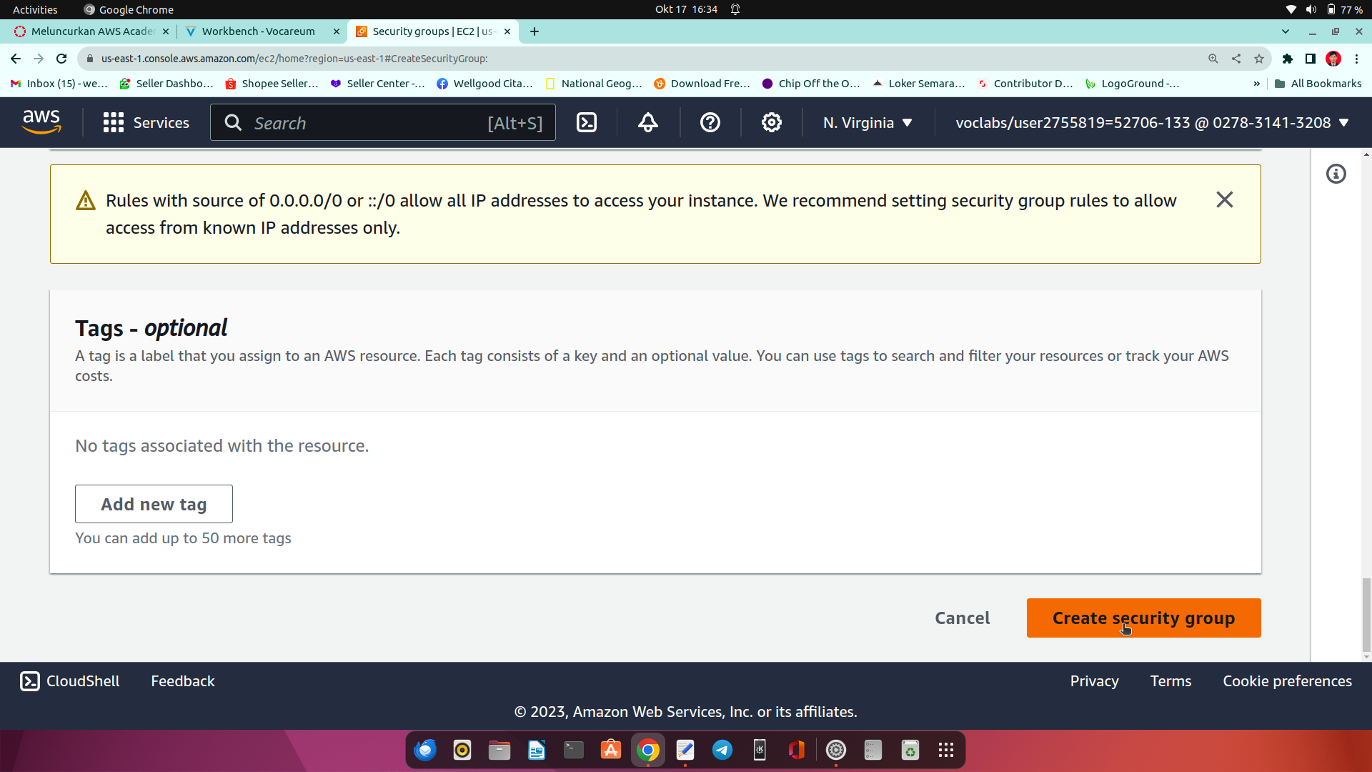 13.setelah semua tersetting dengan benar klik create security group di bagian bawah